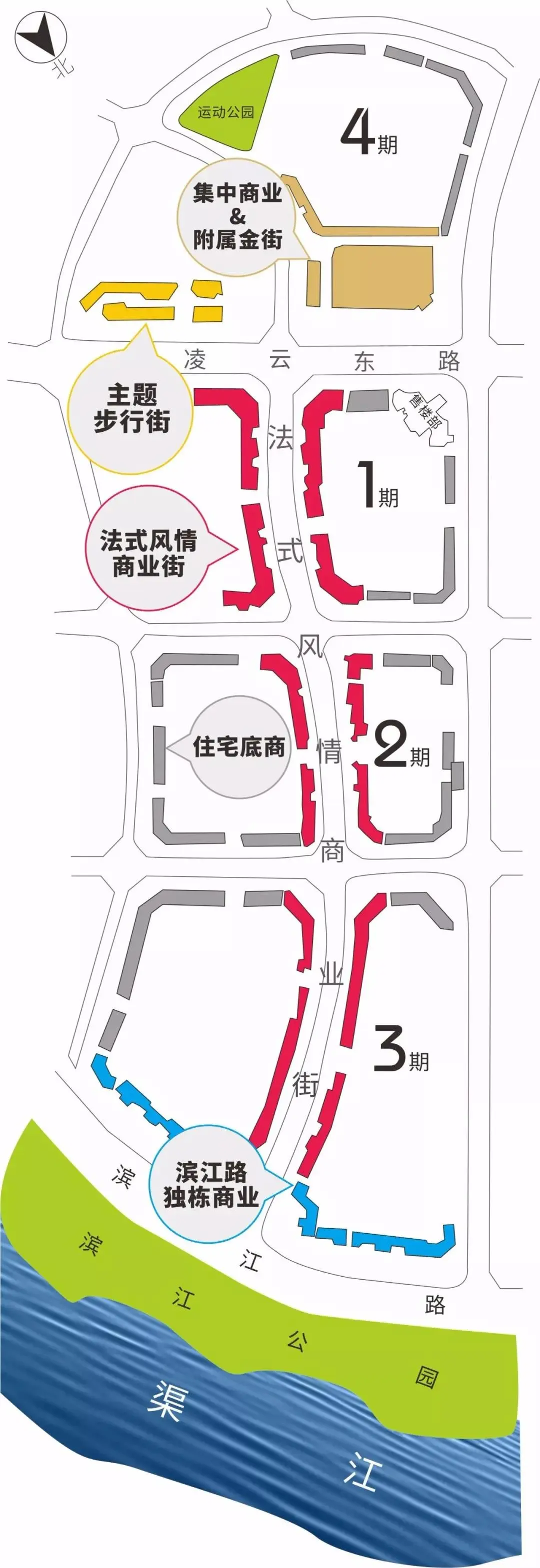 承平盛世1期2期3期法式风情商业街、3期临滨江路独栋商业、4期大型商业综合体、以及未来即将开发的地块中的商业群共同构建起广安未来繁华的城市级商业主轴。
