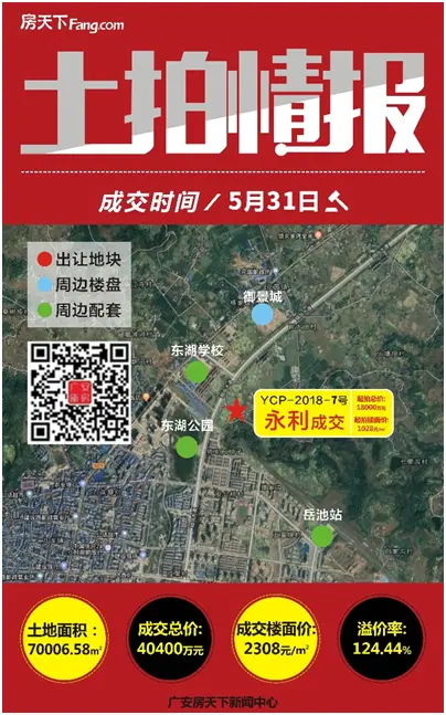 交易现场共6家知名开发商(、金科、永利、凰腾、鸿通-鑫立方-龙鑫、中梁)参与竞拍,经过多轮叫价,最终以总价40400万元成交,按地块计容面积折算楼面地价为2308元/㎡,溢价率为124.44%,竞得人为广安永利房地产开发有限公司,永利作为岳池本地的开发商先后开发了永利·龙湖观澜及岳池永利广场。